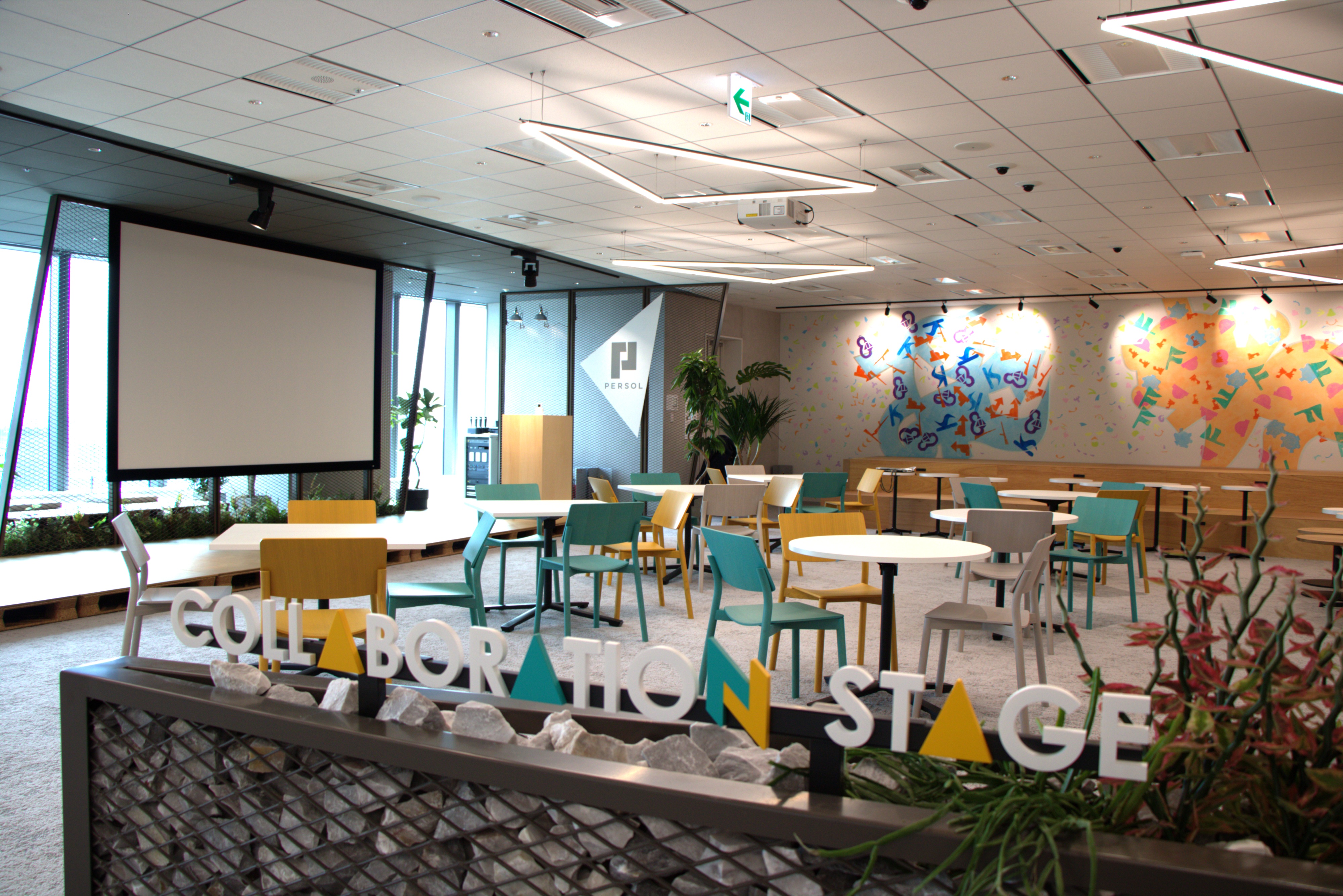 最大80人が着席できるイベントゾーンを新設。ステージや大型スクリーン、配信設備などを備え、社内イベントやキックオフ、トークセッションなど、多様なシーンで活用できる空間となっています。社内イベントゾーンを22階に集約することで、フロア全体が一体感のある場となり、登壇者・参加者がよりエネルギーや臨場感を感じられる設計としています。発信と対話が交わる場として、社員の気づきや次の行動につながる体験を生み出します。
