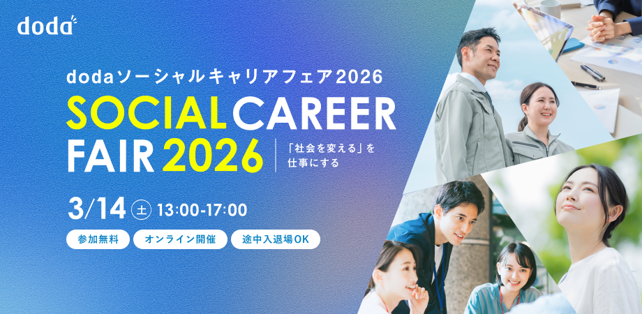 パーソルキャリア株式会社が運営する転職サービス「doda(デューダ)」(編集長:桜井 貴史)は、ソーシャルビジネスや、NPO、NGOなどのソーシャルセクターでの仕事やキャリアに関心のある方を対象としたオンラインイベント「dodaソーシャルキャリアフェア2026」を、2026年3月14日(土)に開催します。