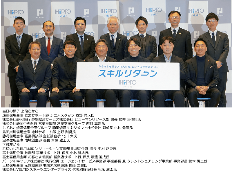 本日1月27日(火)に行った発表会では、HiProによる「スキルリターン」発表のほか、副業・兼業の受け入れを推進する株式会社静岡銀行 静銀総合サービス株式会社、しずおか焼津信用金庫グループ 静岡焼津マネジメント株式会社、静清信用金庫、浜松いわた信用金庫、三島信用金庫によるプロ人材活用の事例紹介を行いました。あわせて、静岡市を拠点とするプロバスケットボールクラブ「ベルテックス静岡」との連携施策についても発表しました。