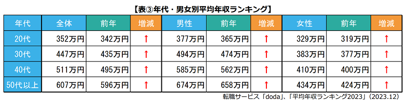 「20代」の平均年収は352万円(昨対+10万円)、「30代」は447万円(昨対+12万円)、「40代」は511万円(昨対+16万円)、「50代以上」は607万円(昨対+11万円)と、全年代で前回から10万円以上増加しました【表③】。男女別に見ても、男性は全年代で、女性は20代・40代・50代以上で10万円以上アップしています。