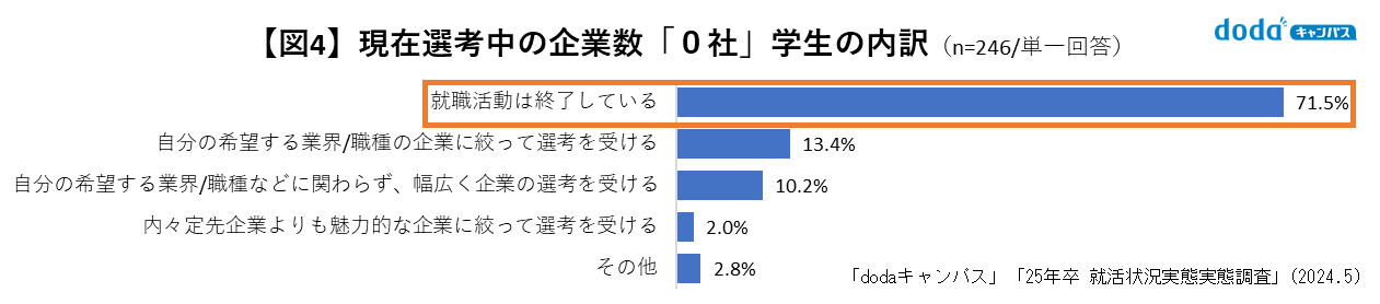 現在選考中企業数「0社」学生の71.5%は就活を終了していることが明らかに