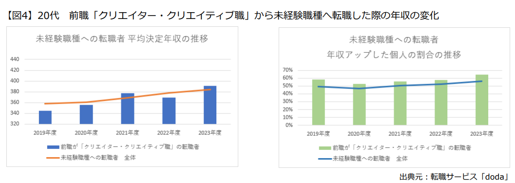 20代の未経験職種への転職者は、2019年度から2023年度にかけて約1.4倍に増加。転職前後の年収の変化をみると、2023年度は6割近くの個人が年収アップをかなえ、平均決定年収金額は2019年度と比べて26万円アップ(358万円→384万円)しています(図3)。なお、過去5年間で平均決定年収金額の増加が目立った職種や転職後に年収アップをかなえた個人の割合が大きかったのは「クリエイター・クリエイティブ職」「営業職」「事務・アシスタント職」となっています。