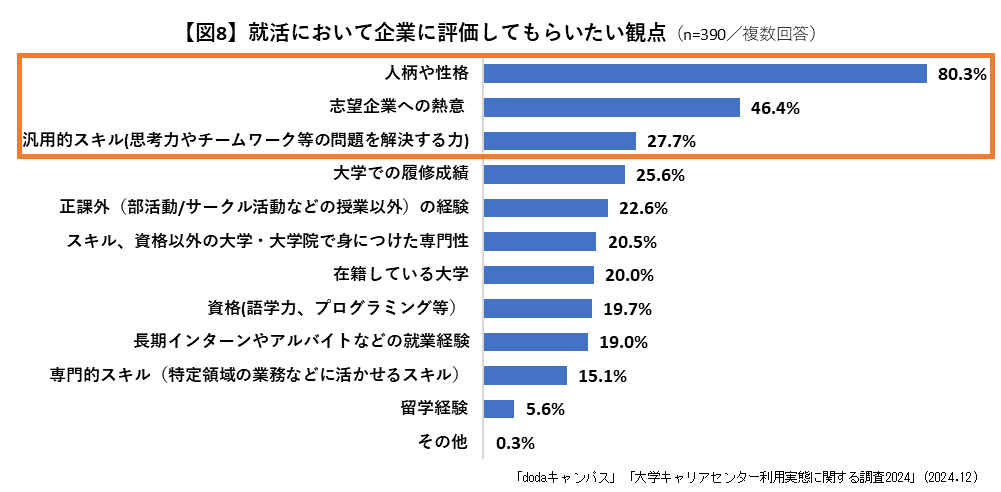 就活において企業に評価して欲しいポイントは「人柄や性格」「熱意」に加え「汎用的スキル」が上位に