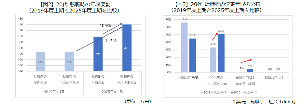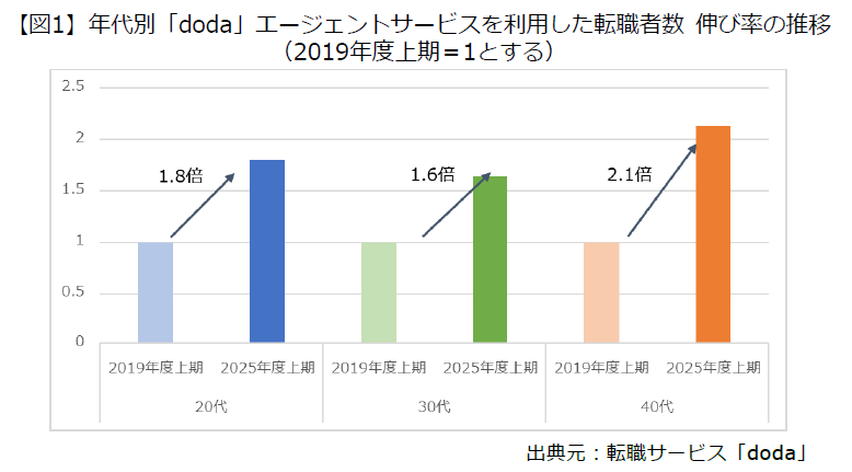対象:2019年度上期(2019年4月~9月)と2025年度上期(2025年4月~9月)にdodaエージェントサービスを利用して転職した個人