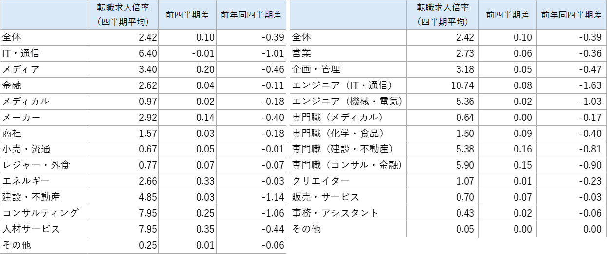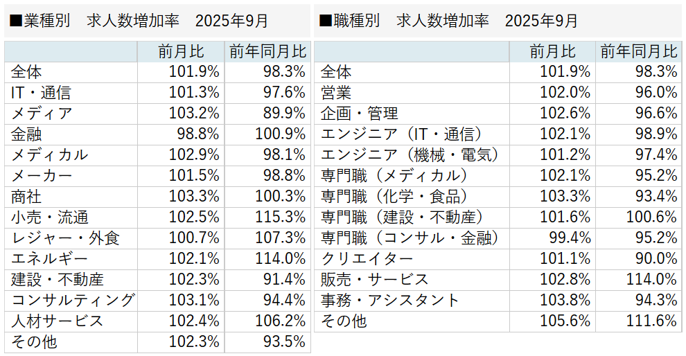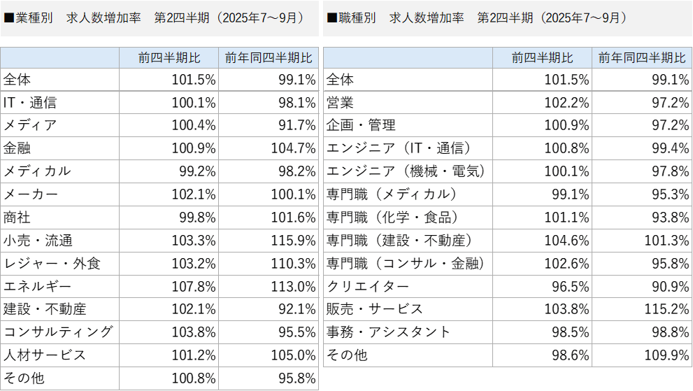 【転職求人倍率(業種別・職種別)/2025年 第2四半期(7~9月)】