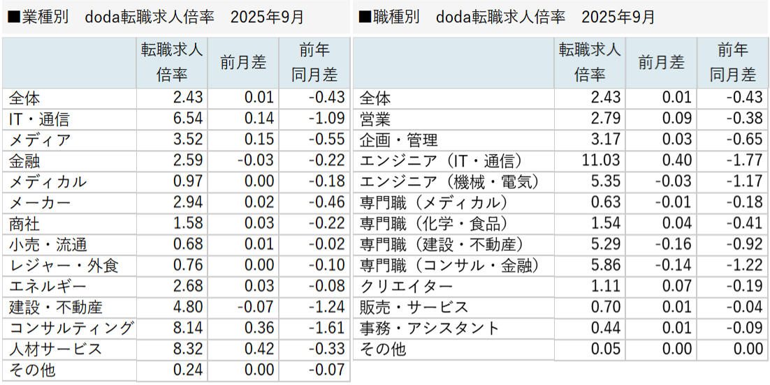 パーソルキャリア株式会社が運営する転職サービス「doda(デューダ)」(編集長:桜井 貴史)は、2025年9月の転職求人倍率をまとめた「doda転職求人倍率」を発表いたします。