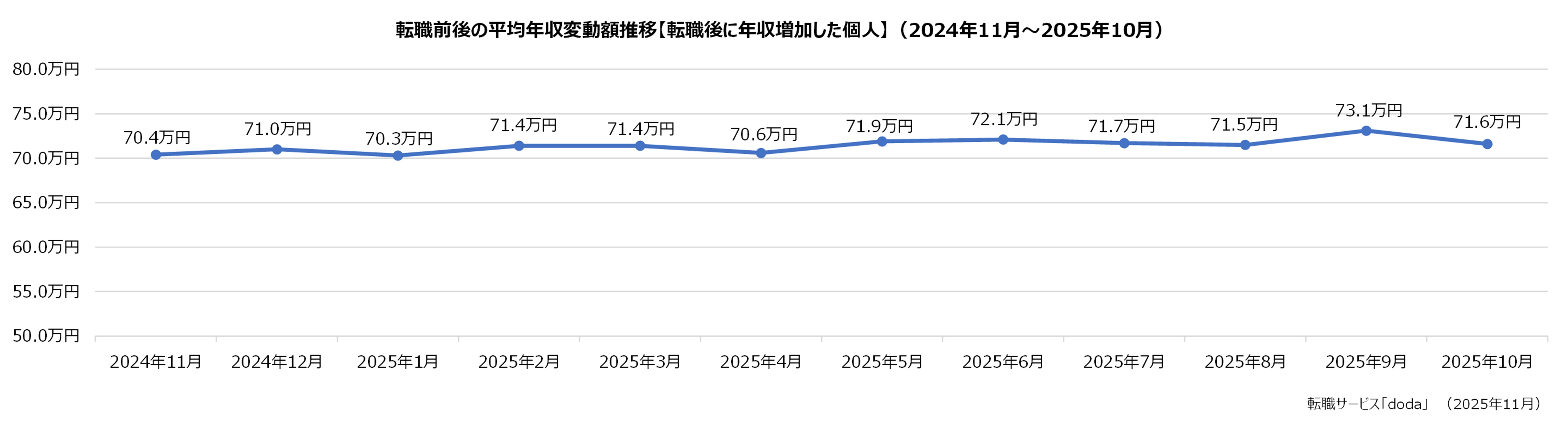 転職前後の平均年収変動額【転職後に年収増加した個人】:+71.6万円(前月差:-1.5万円)