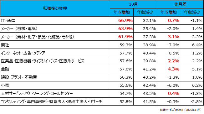 転職後に年収増加した個人が多かった業種は、「IT・通信」(66.9%)、次いで「メーカー(機械・電気)」(63.9%)、そして「メーカー(素材・化学・食品・化粧品・その他)」(61.9%)が続きました。