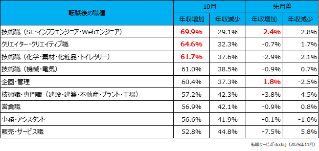 転職後に年収増加した個人が多かった職種は、「技術職(SE・インフラエンジニア・Webエンジニア)」(69.9%)、次いで「クリエイター・クリエイティブ職」(64.6%)、そして「技術職(化学・素材・化粧品・トイレタリー)」(61.7%)が続きました。