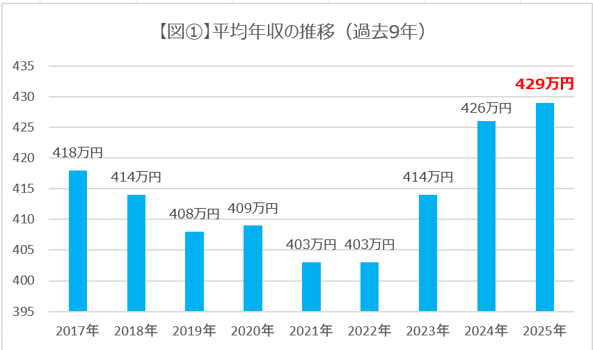 ・2025年の平均年収は429万円で、前年から3万円アップ