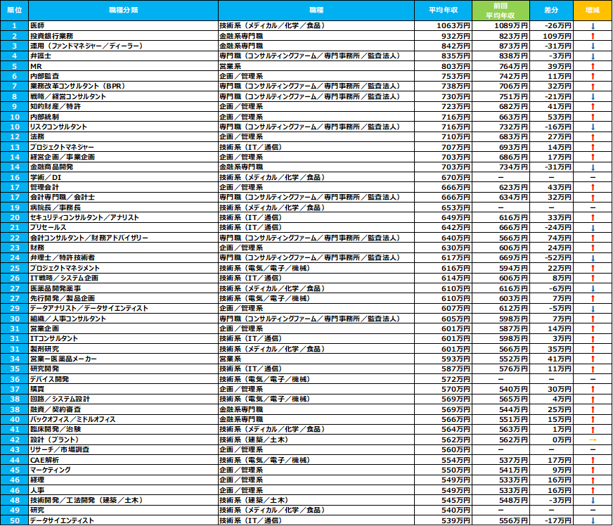 職種別:1位は3年連続「医師」で1,063万円。職種分類ではトップ10のうち、「専門職(コンサルティングファーム/専門事務所/監査法人)」の分類が4つを占める