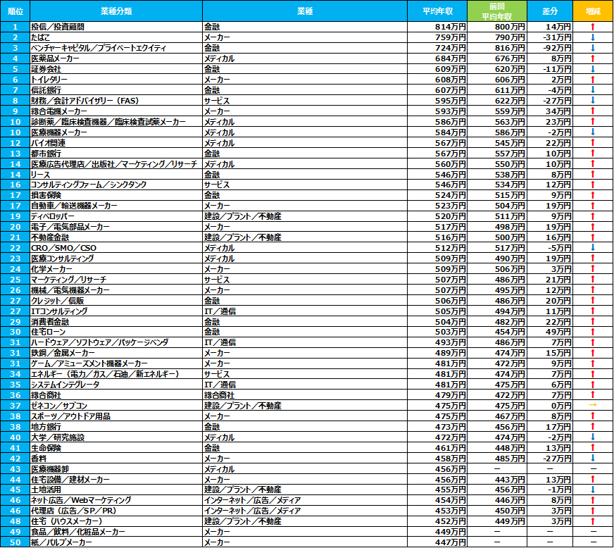 【表②業種別平均年収ランキング 上位50位】
