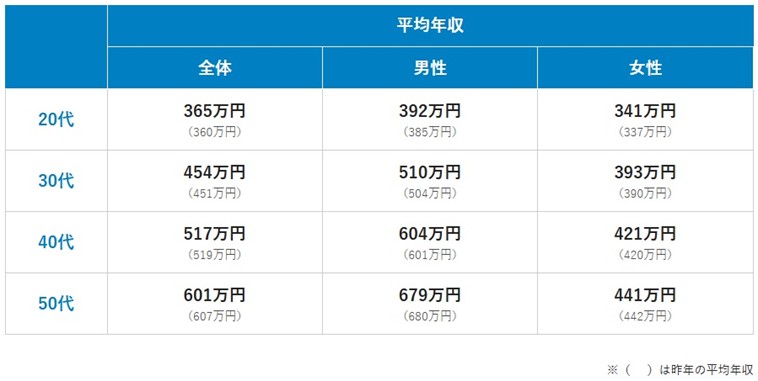 2025年の年代別の平均年収は「20代」が365万円、「30代」が454万円、「40代」が517万円、「50代以上」が601万円でした。【表③】男女別に見ると50代以上を除くすべての年代で前年よりも平均年収がアップしました。