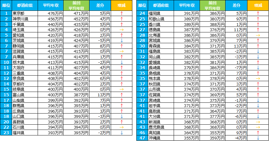 都道府県別:47都道府県のうち28都府県で年収アップ。トップ4を関東の都県が占める