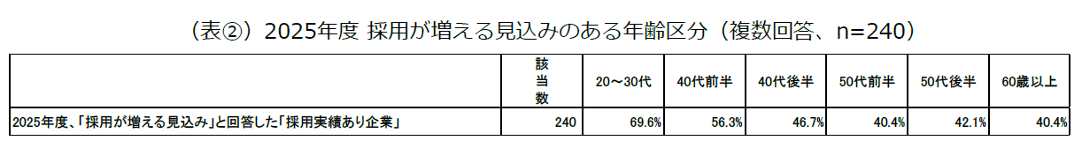 続いて、「採用実績あり企業」のうち、2025年度にいずれかの年齢区分で「採用が増える見込みがある」とした企業240社を対象に、年齢区分別の採用見込みを聞いたところ、最も多かったのは20~30代(約7割)でした。加えて、40代後半以上の採用についても、40代後半(46.7%)、50代前半(40.4%)、50代後半(42.1%)、60歳以上(40.4%)と、4割以上の企業が採用増加を見込んでいることが分かりました(表②)。