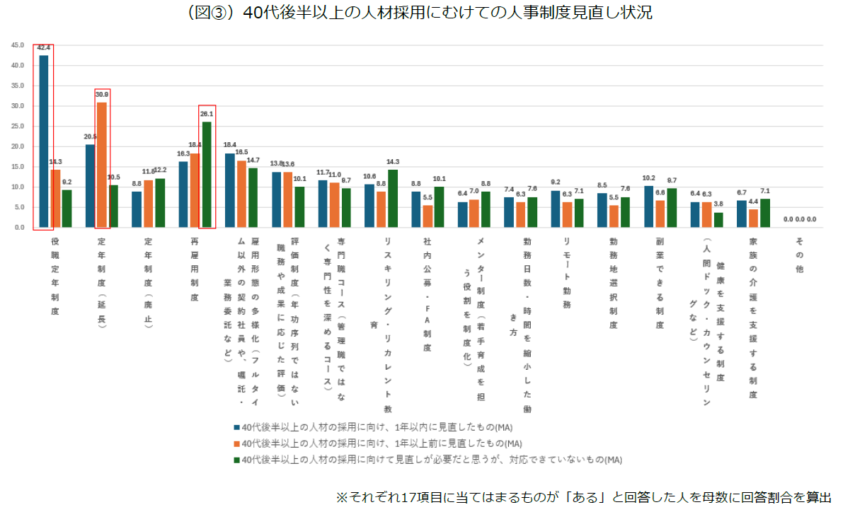 続いて、40代後半以上の採用に向けた人事制度の見直し状況について、それぞれ当てはまるものが「ある」人を対象に聞いたところ、「1年以内に見直した」制度のトップは「役職定年」(42.4%)でした(図③)。また、「1年以上前に見直した」制度は「定年制度(延長)」が最多で30.9%でした。一方、「見直しが必要だと思うが、対応できていないもの」は「再雇用制度」が最も多く26.1%でした。