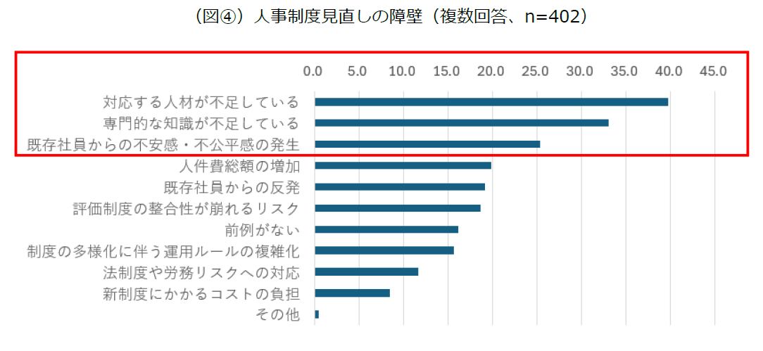 「採用実績あり企業」のうち、人事制度見直しの障壁が「ある」と回答した402人を対象に、11項目から当てはまる障壁を複数回答で聞いたところ、「対応する人材が不足している」が最多で39.8%でした(図④)。次いで、「専門的な知識が不足している」(33.1%)、「既存社員からの不安感・不公平感の発生」(25.4%)となりました。