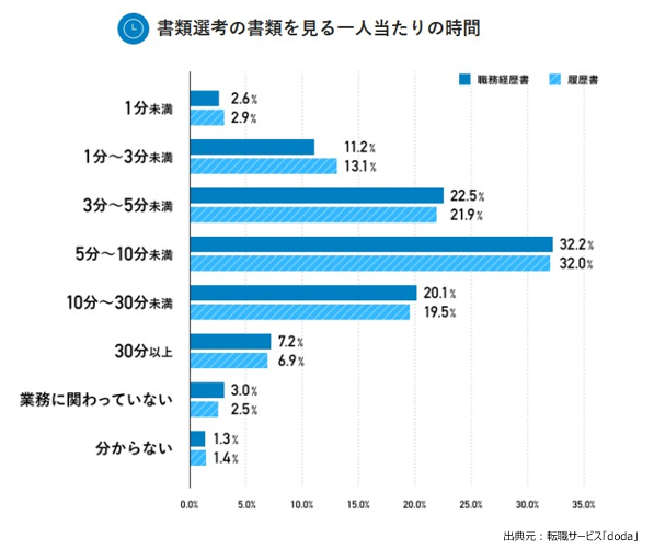 時間は「5分以上10分未満」が最多。履歴書・職務経歴書ともに