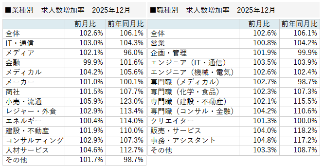 【求人数増加率(業種別・職種別)/2025年12月】
