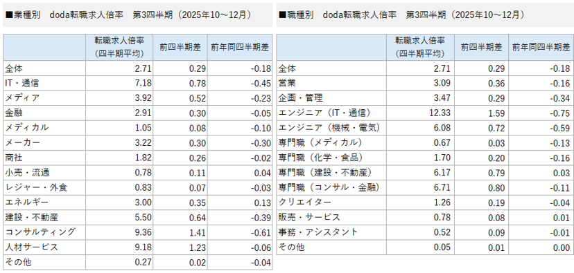 【転職求人倍率(業種別・職種別)/2025年 第3四半期(10~12月)】