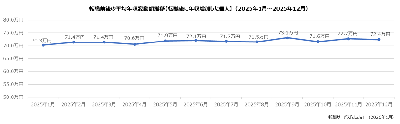 転職前後の平均年収変動額【転職後に年収増加した個人】:+72.4万円(前月差:-0.3万円)