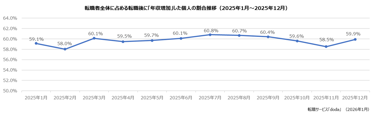 転職後に「年収増加」した個人の割合は、59.9%(前月差:+1.4ポイント)でした。