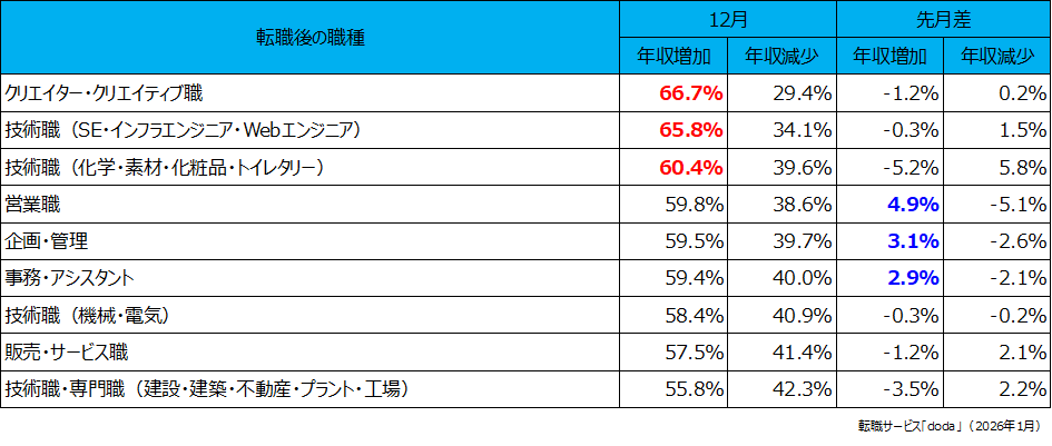 転職後に年収増加した個人が多かった職種は、「クリエイター・クリエイティブ職」(66.7%)、次いで「技術職(SE・インフラエンジニア・Webエンジニア)」(65.8%)、そして「技術職(化学・素材・化粧品・トイレタリー)」(60.4%)が続きました。