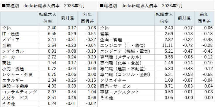 パーソルキャリア株式会社が運営する転職サービス「doda(デューダ)」(編集長:桜井 貴史)は、2026年2月の転職求人倍率をまとめた「doda転職求人倍率」を発表いたします。