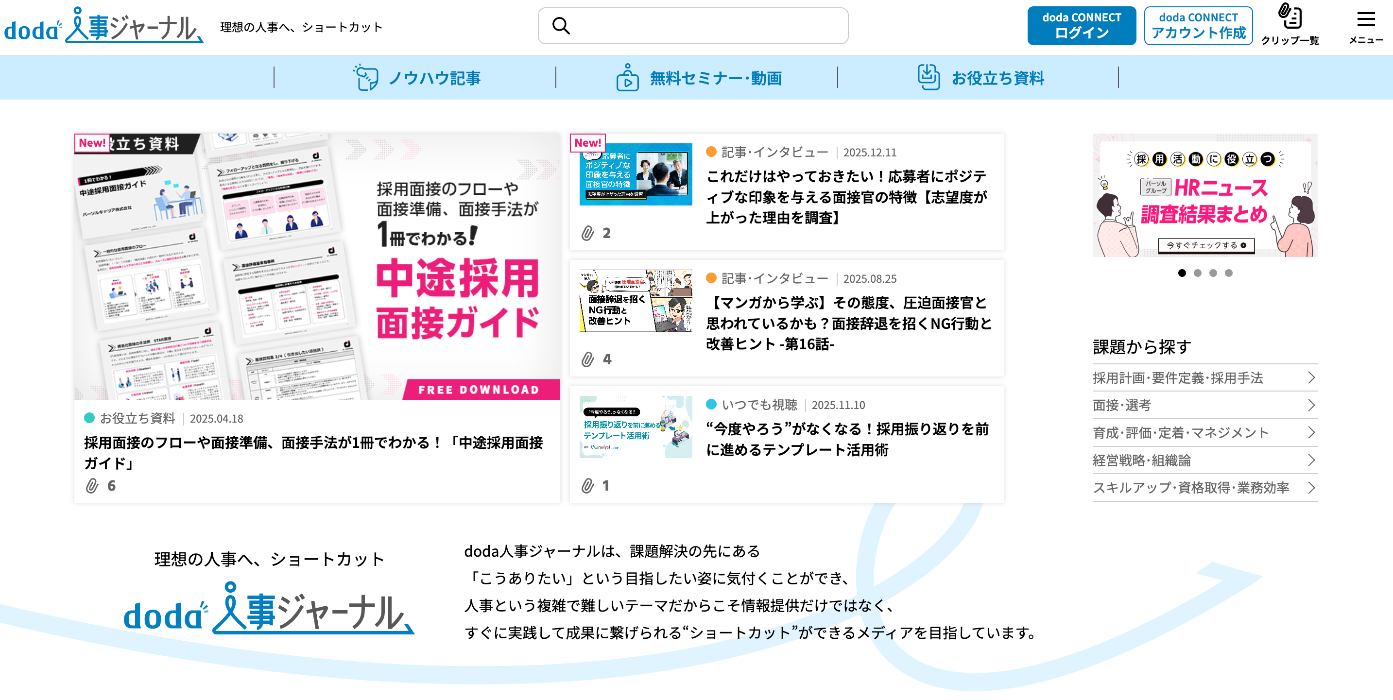 近年、企業の人事担当者は採用活動、社員の育成やエンゲージメントの向上、多様なはたらき方を推進するための制度整備、賃金の見直しなど、取り組むべき課題は多岐にわたります。こうした課題に向き合う人事担当者に向けて、旧「d’s JOURNAL」では、採用計画、面接・選考、育成・評価、経営戦略・組織開発など、課題解決のヒントになる各種セミナーや、記事・動画などのコンテンツを提供してきました。一方で、情報量の増加に伴い、必要な情報へ辿りつくまでに時間がかかる、どれが自身にあった情報なのか分かりづらいという課題もありました。そこで今回のリニューアルを機に、「doda CONNECT」※1のプレアカウント※2登録機能を導入。「“あなたの”理想の人事へ、ショートカット」というコンセプトのもと、アカウント登録時のユーザー属性や閲覧履歴に基づいて情報を最適化することで、一人ひとりの課題や関心に沿った、よりパーソナライズされた情報提供を可能にしました。また、転職サービス「doda」が運営するメディアであることを明確にし、安心して利用いただけるよう、名称を「doda人事ジャーナル」へ変更しました。