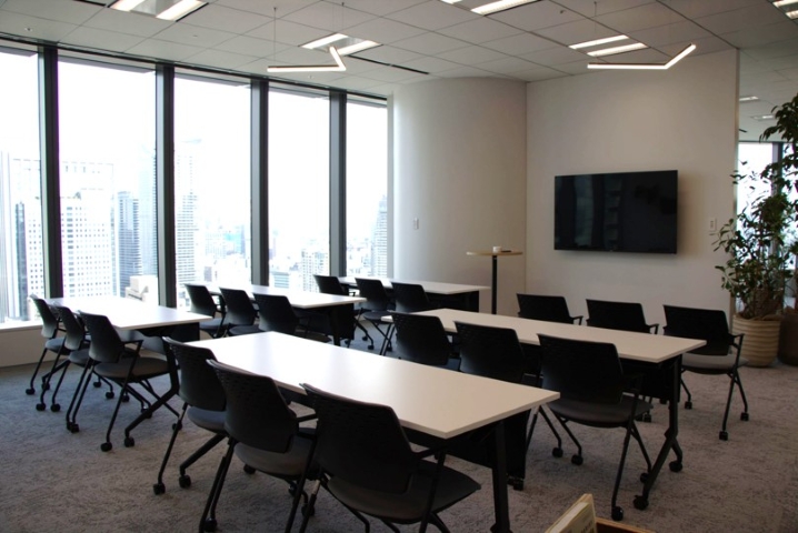 最大80人が着席できるイベントゾーン。ステージや大型スクリーン、配信設備などを備え、社内イベントやキックオフ、トークセッションなど、多様なシーンで活用できる空間となっています。